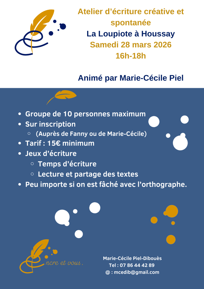 Atelier_ecriture Deuxième édition de cet atelier d’écriture qui a connu un franc succès la première fois ! Inscrivez vous dès maintenant, vous ne regretterez pas, même s’il vous semble (et peut-être justement !) que l’écriture n’est pas « votre truc » !!!